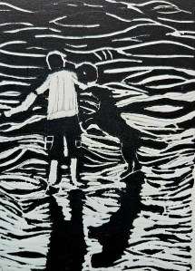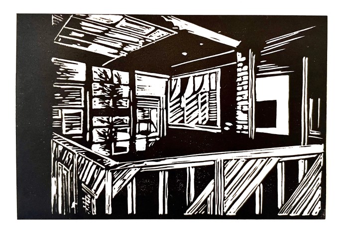 Rhi Johnson, Abandoned #17, fine art relief print on paper, framed copy available, 10 x 15 cm, POABrigitte Zimmerman, Our Shadows, relief print, 15 x 10 cm inquiries can be made to artist from this siteAnn Bartholomeusz, My Shadow, relief print on paper, 15 x 10 cm, inquiries can be made to artist from this siteMargaret Robertson, Translucent, relief print on paper,: Jo Stacey, Rhino in Flight, relief print on paper, 15 x 10 cm, inquiries can be made to artist from this site.