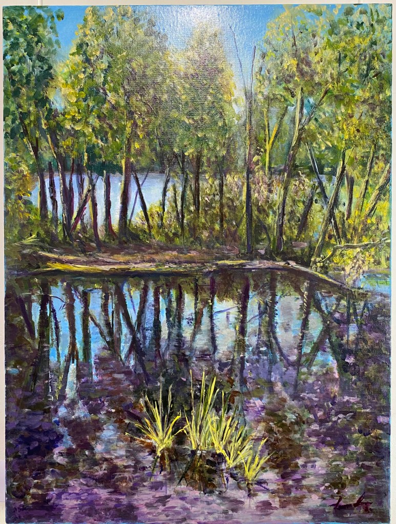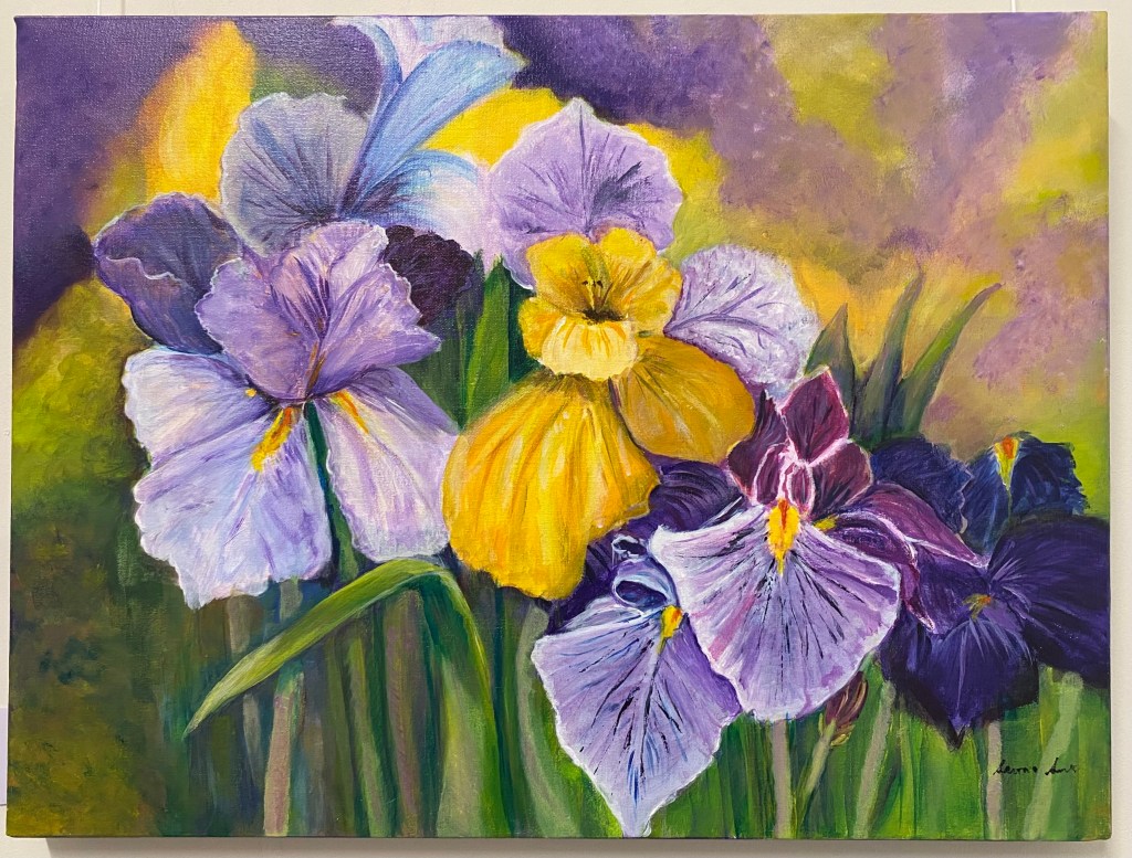 Laurna Love, Tropical Garden, acrylic on canvas, 45 x 60 cm $450Laurna Love Dragonfly acrylic on canvas, 24 x18 cm $120 Laurna Love, four paintings installed; front room West side at Gallery 48