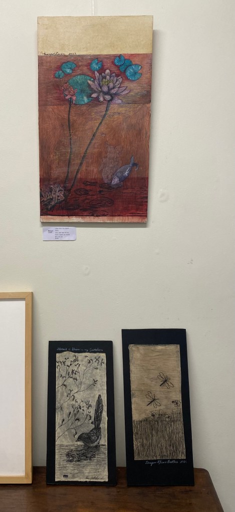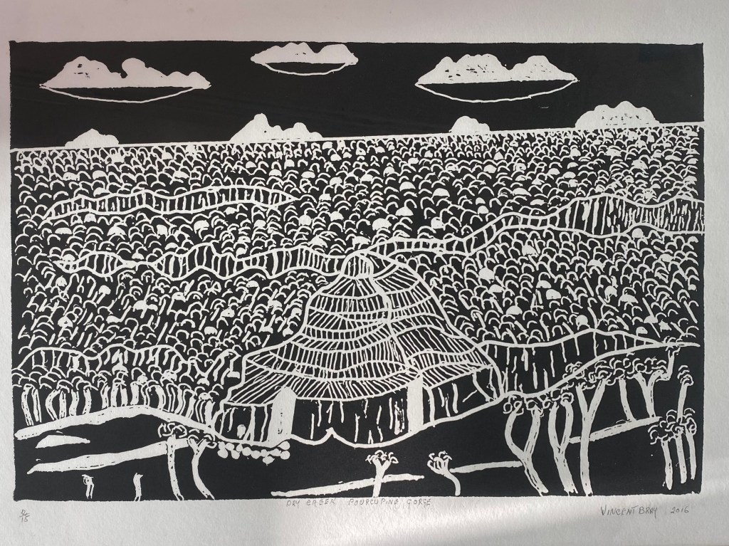 Anne Lord, Pea bush #18 acrylic on canvas , 64 x 50 cm $450Green frog on step 3 in gardenVincent Bray, Dry Creek Porcupine Gorge 2/15, 2016, relief print on paper, 33.5 x 51 cm SOLD